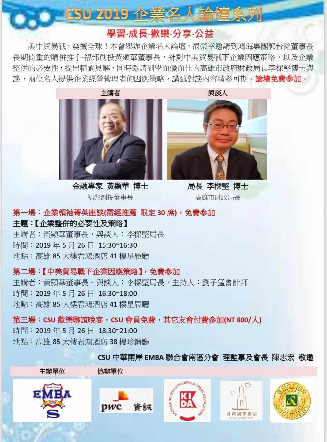 CSUS中華兩岸EMBA聯合會南區分會 2019企業名人論壇系列~2019/05/262019企業名人論壇系列很榮幸特別邀請~目前已輔導超過100多家上市櫃公司,包含鴻海集團所有公司辦理上市櫃掛牌及寶成集團的福邦創投公司-黃顯華董事長,以及親民的高雄市政府財政局長-李樑堅教授。